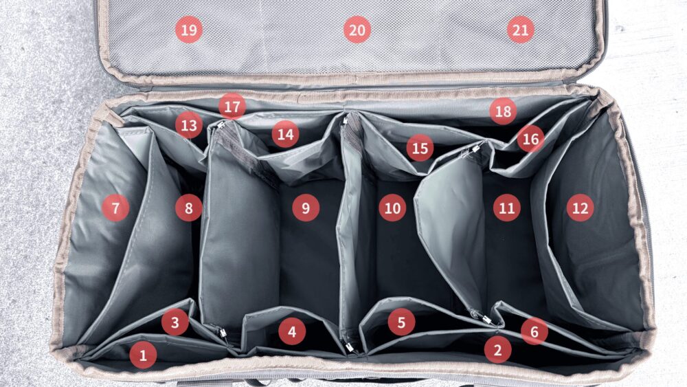 キャンプギアバッグは、この最大21個のポケットによって、多くの小物を整理して収納することができます。