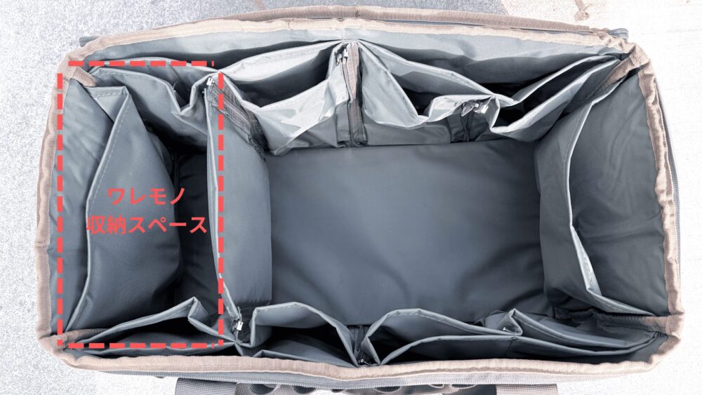 仕切りがあることでキャンプギア同士が接触しないので、キャンプギアが傷つくのを防ぐこともできます。お気に入りのキャンプギアを収納しても安心です。