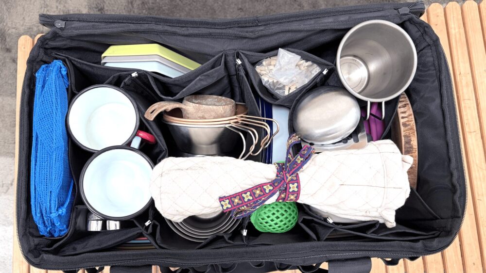 私は食器や調理器具類の小物をキャンプギアバッグに収納しています。