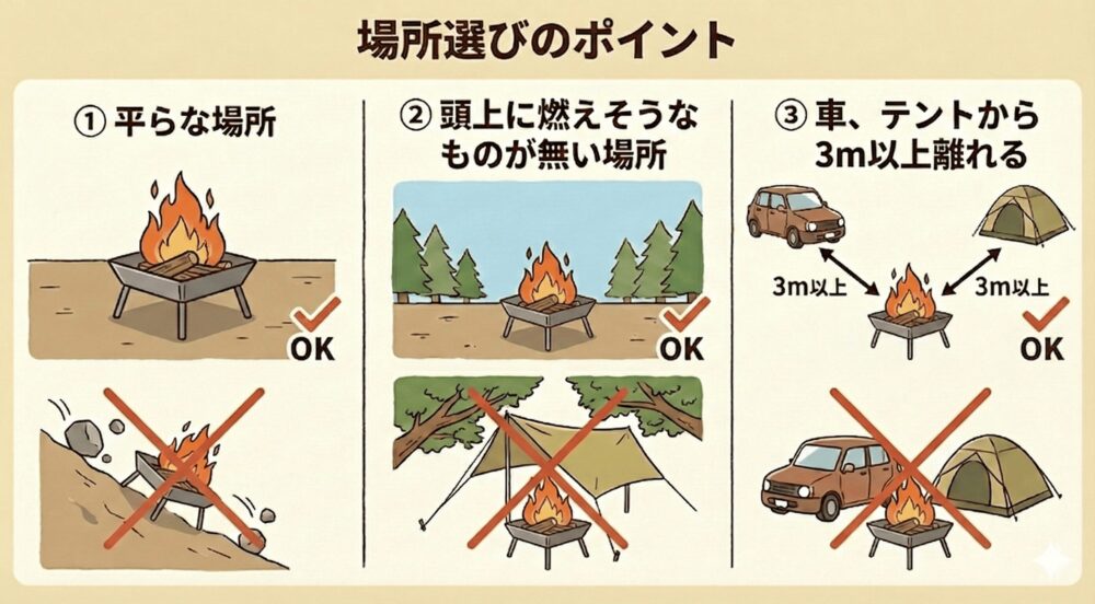 | 場所選び | 平らな場所を選ぶ 頭上に燃えそうなもの(木の枝や葉っぱ)がないかを確認する テント、車から最低3mは離れる |